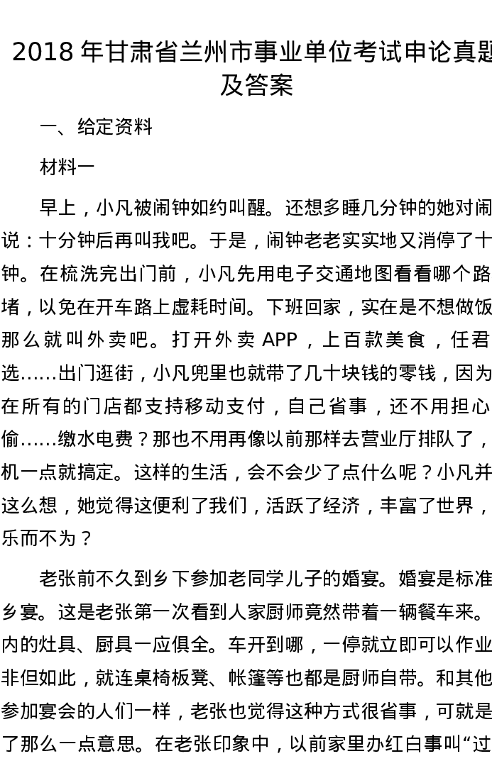 2018年甘肃省兰州市事业单位考试申论真题及答案