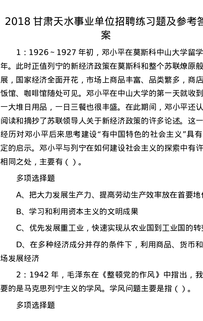 2018甘肃天水事业单位招聘练习题及参考答案