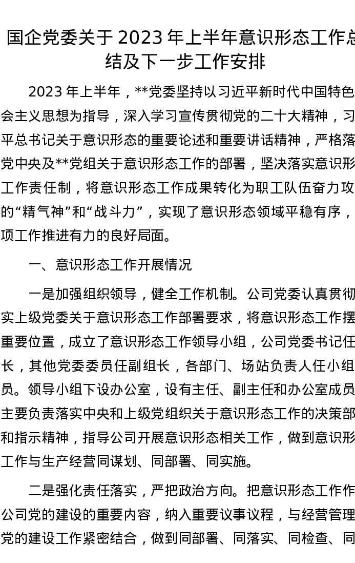 国企党委关于2023年上半年意识形态工作总结及下一步工作安排