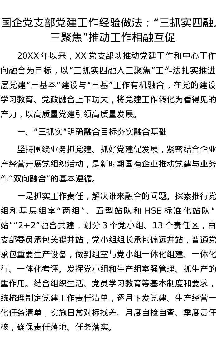国企党支部党建工作经验做法:“三抓实四融入三聚焦”推动工作相融互促