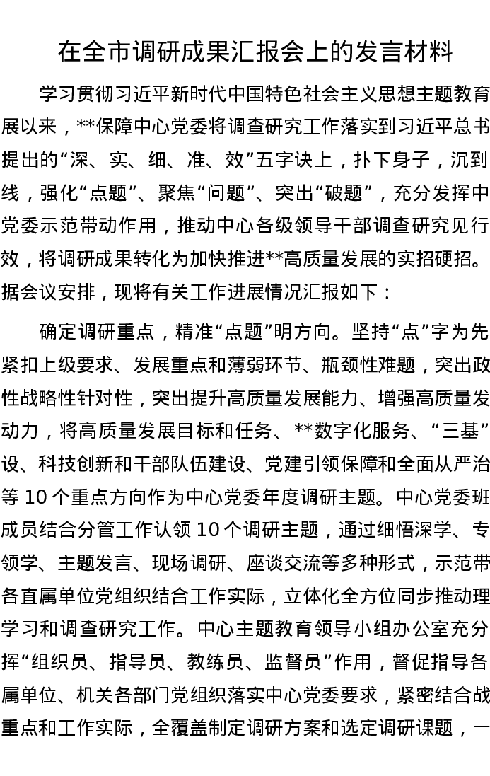 在全市调研成果汇报会上的发言材料