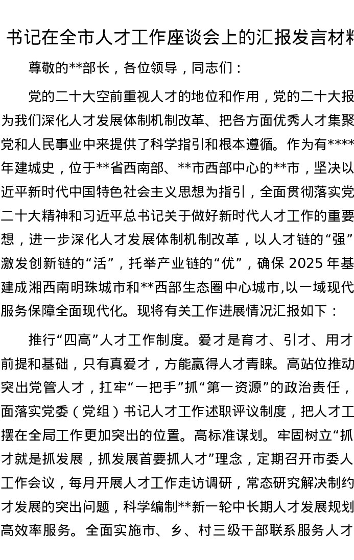 书记在全市人才工作座谈会上的汇报发言材料