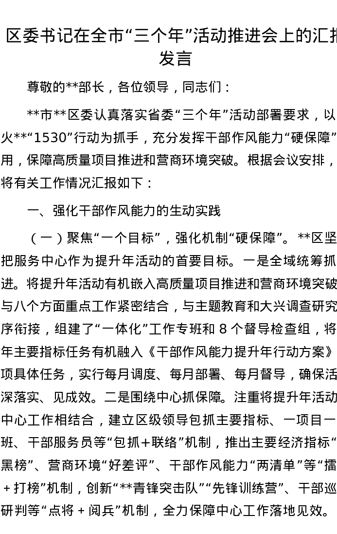 区委书记在全市“三个年”活动推进会上的汇报发言
