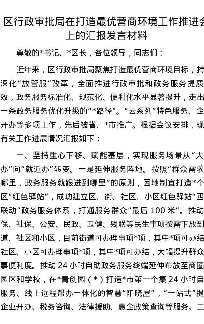 区行政审批局在打造最优营商环境工作推进会上的汇报发言材料