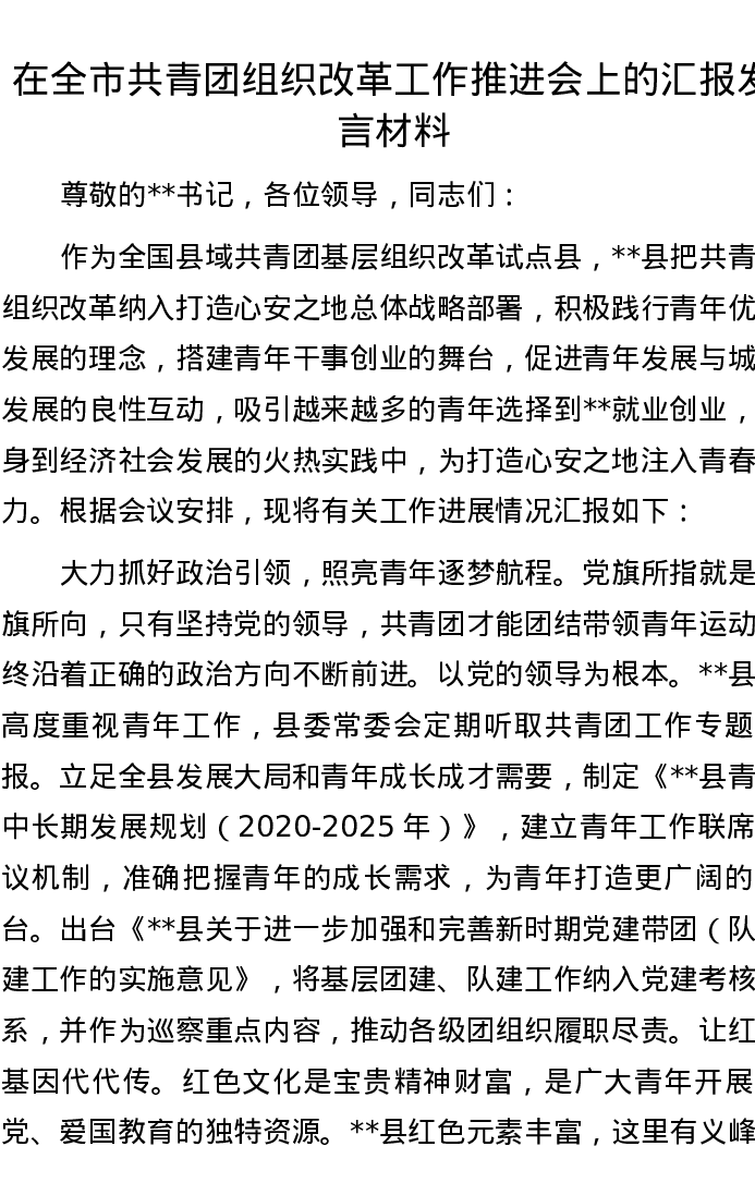 在全市共青团组织改革工作推进会上的汇报发言材料