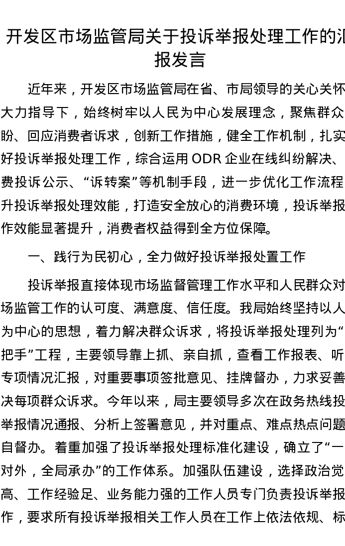开发区市场监管局关于投诉举报处理工作的汇报发言