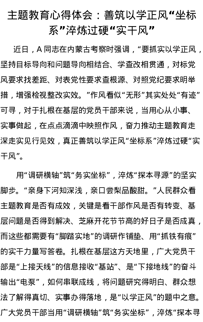 主题教育心得体会:善筑以学正风“坐标系”淬炼过硬“实干风”(特色社会主义思想)