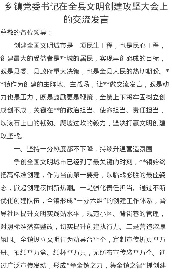 乡镇党委书记在全县文明创建攻坚大会上的交流发言(特色社会主义思想)