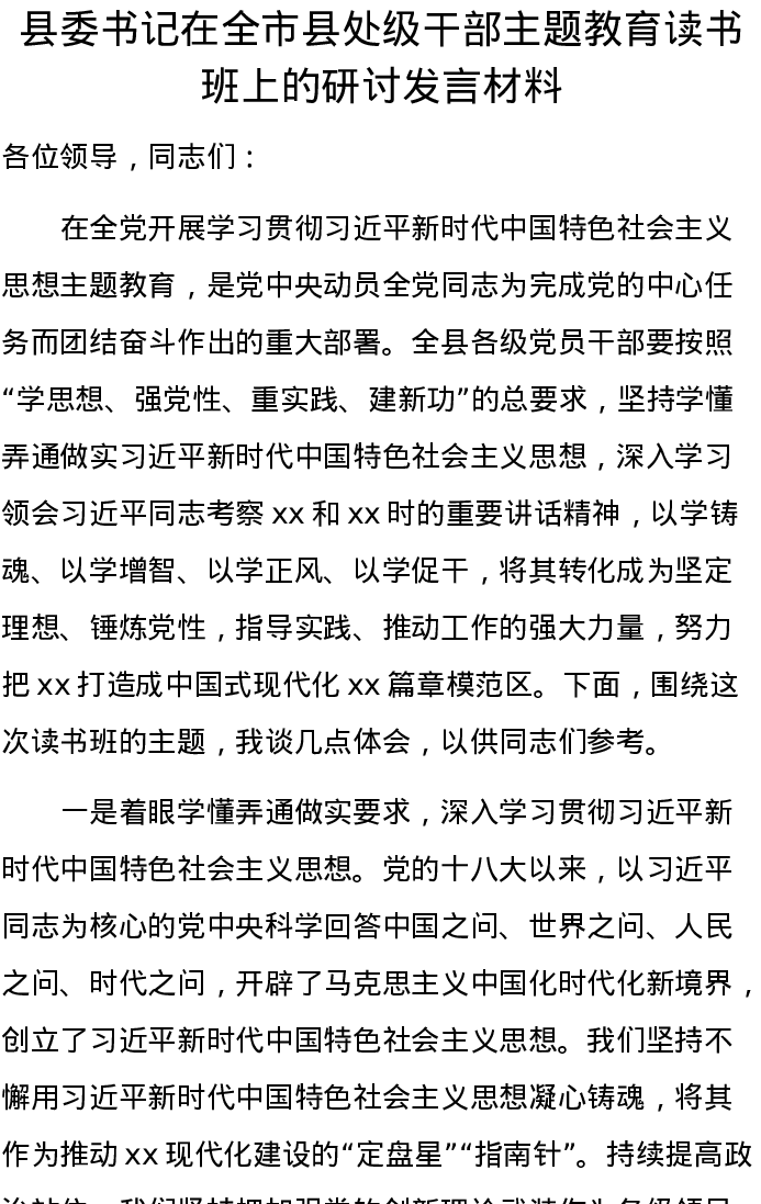 县委书记在全市县处级干部主题教育读书班上的研讨发言材料(特色社会主义思想)