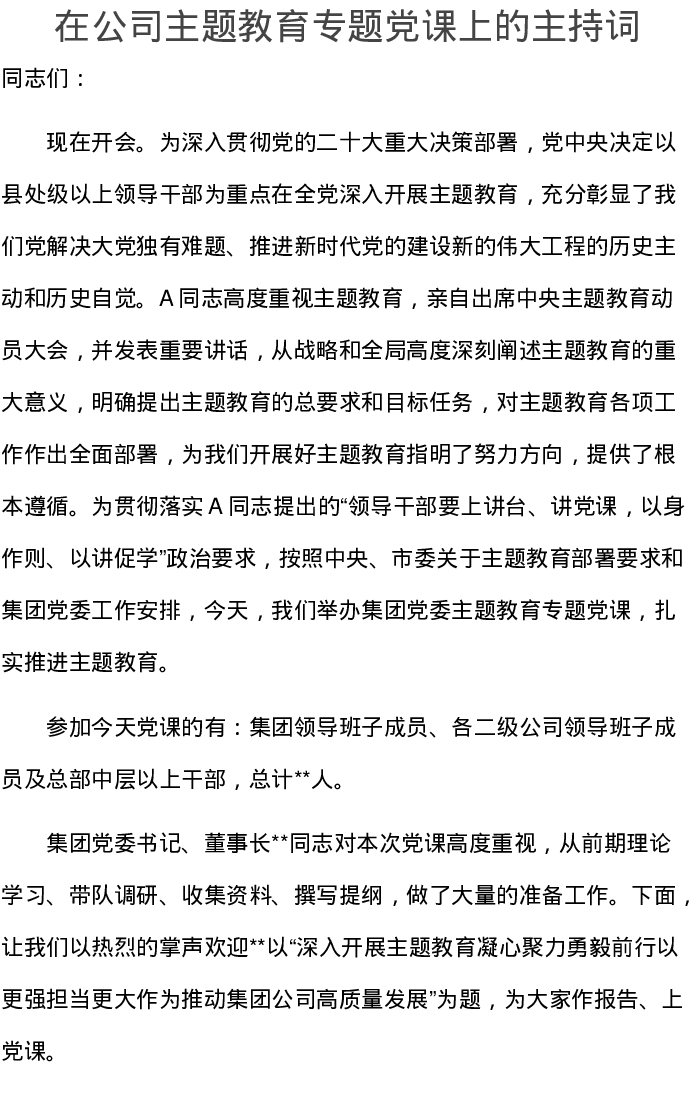 在公司主题教育专题党课上的主持词(特色社会主义思想)