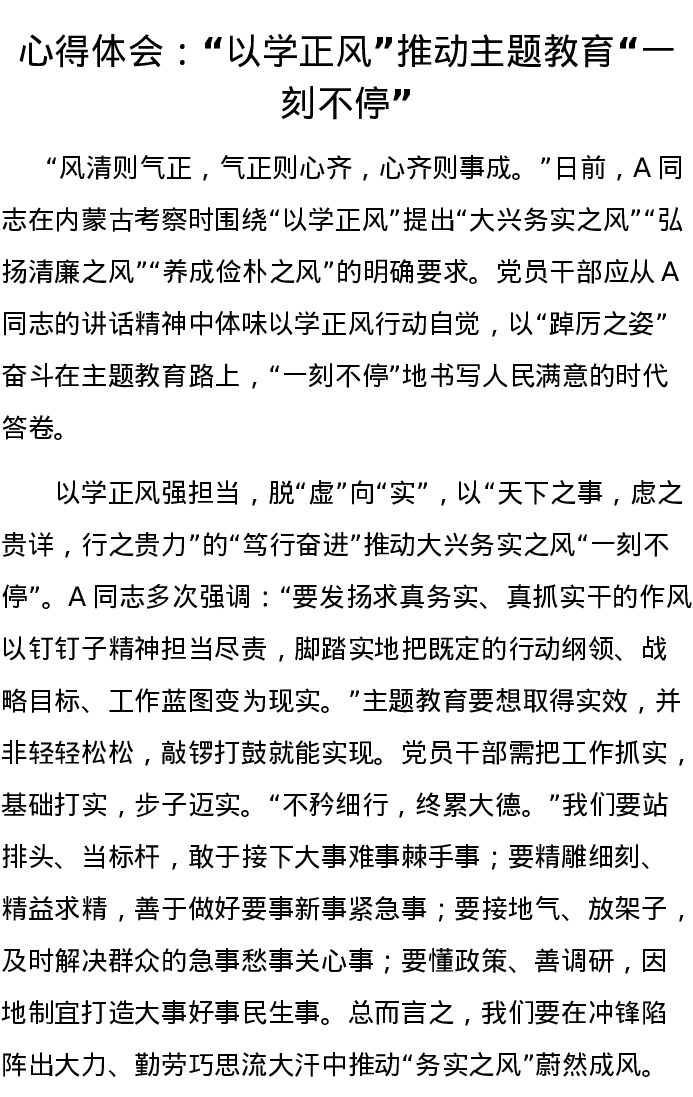 心得体会:“以学正风”推动主题教育“一刻不停”(特色社会主义思想)