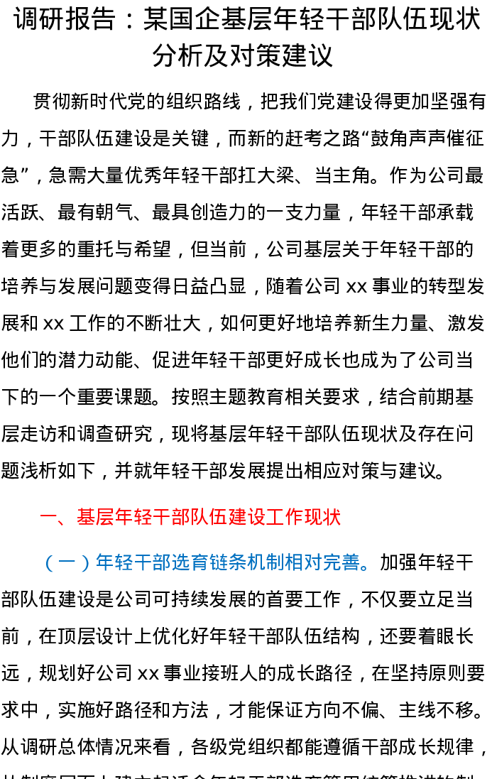 调研报告某国企基层年轻干部队伍现状分析及对策建议