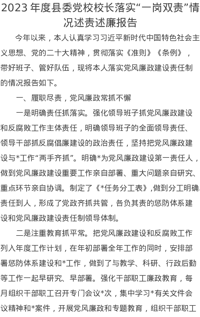 2023年度县委党校校长落实“一岗双责”情况述责述廉报告