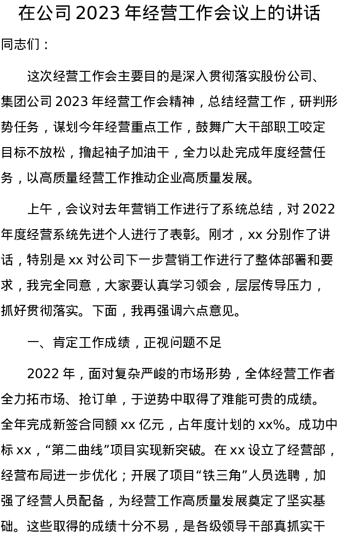 公司2023年经营工作会议讲话(集团企业表彰大会)
