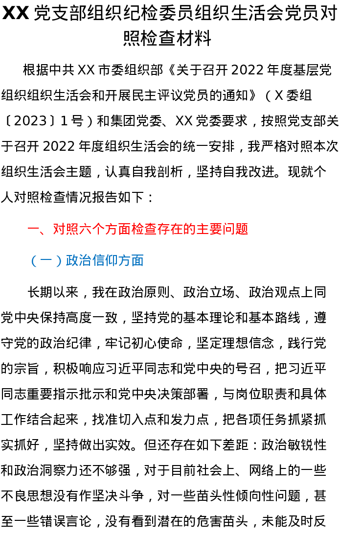 XX党支部组织纪检委员组织生活会党员对照检查材料