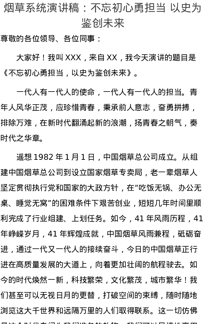 烟草系统演讲稿:不忘初心勇担当 以史为鉴创未来