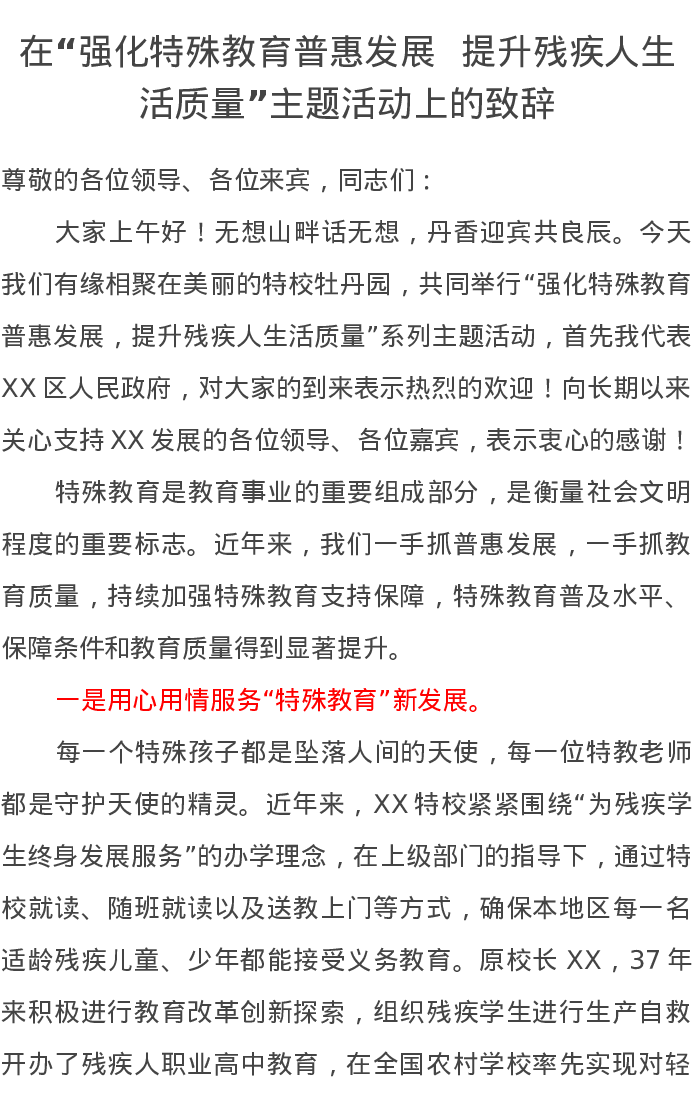 在“强化特殊教育普惠发展提升残疾人生活质量”主题活动上的致辞