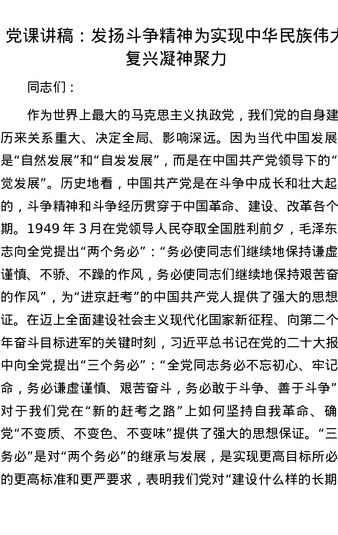 党课讲稿:发扬斗争精神 为实现中华民族伟大复兴凝神聚力
