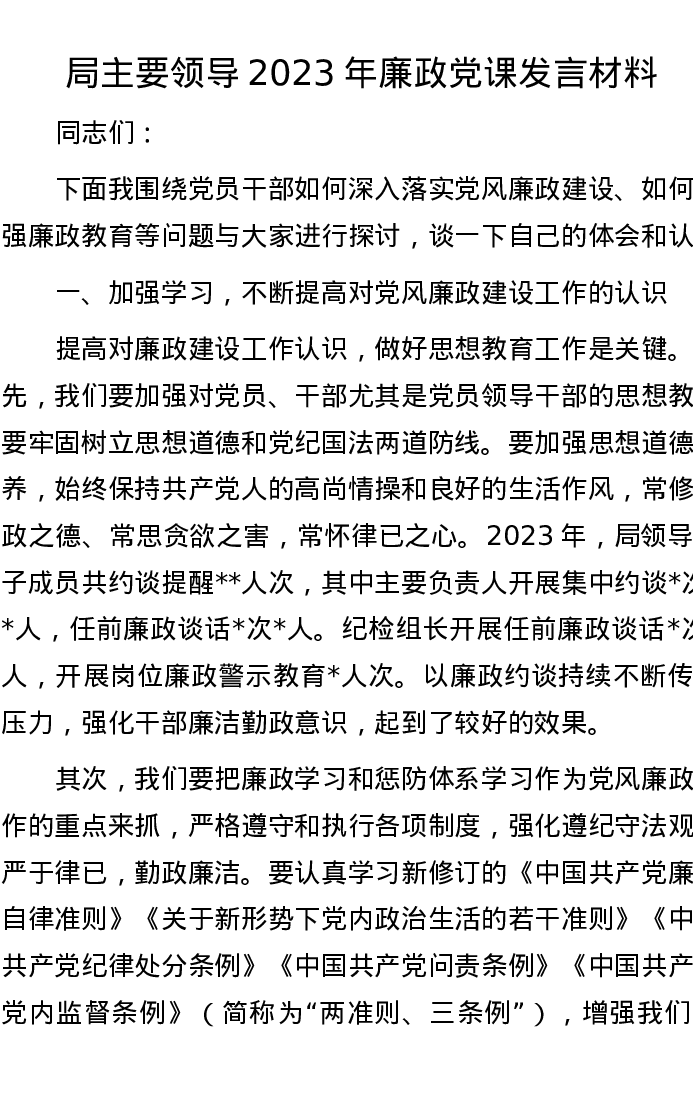 局主要领导2023年廉政党课发言材料