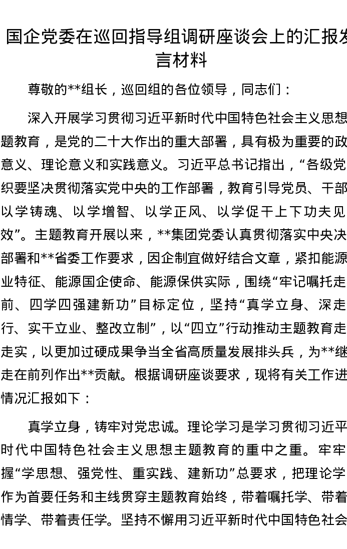 国企党委在巡回指导组调研座谈会上的汇报发言材料