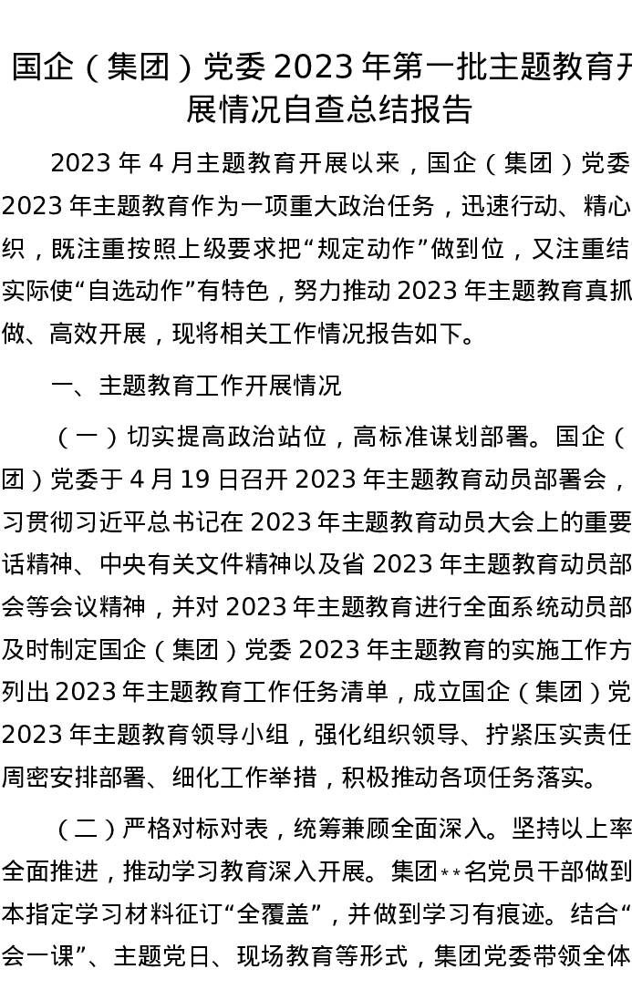 国企(集团)党委2023年第一批主题教育开展情况自查总结报告