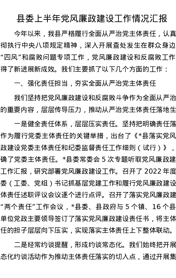县委上半年党风廉政建设工作情况汇报