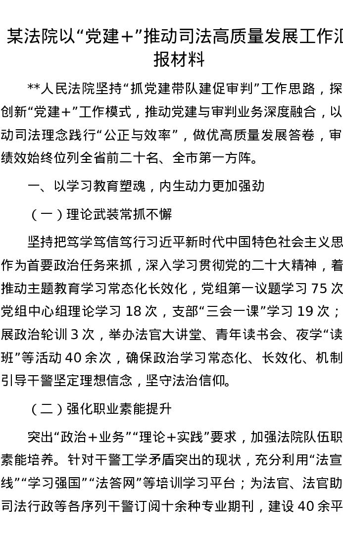 某法院以“党建+”推动司法高质量发展工作汇报材料