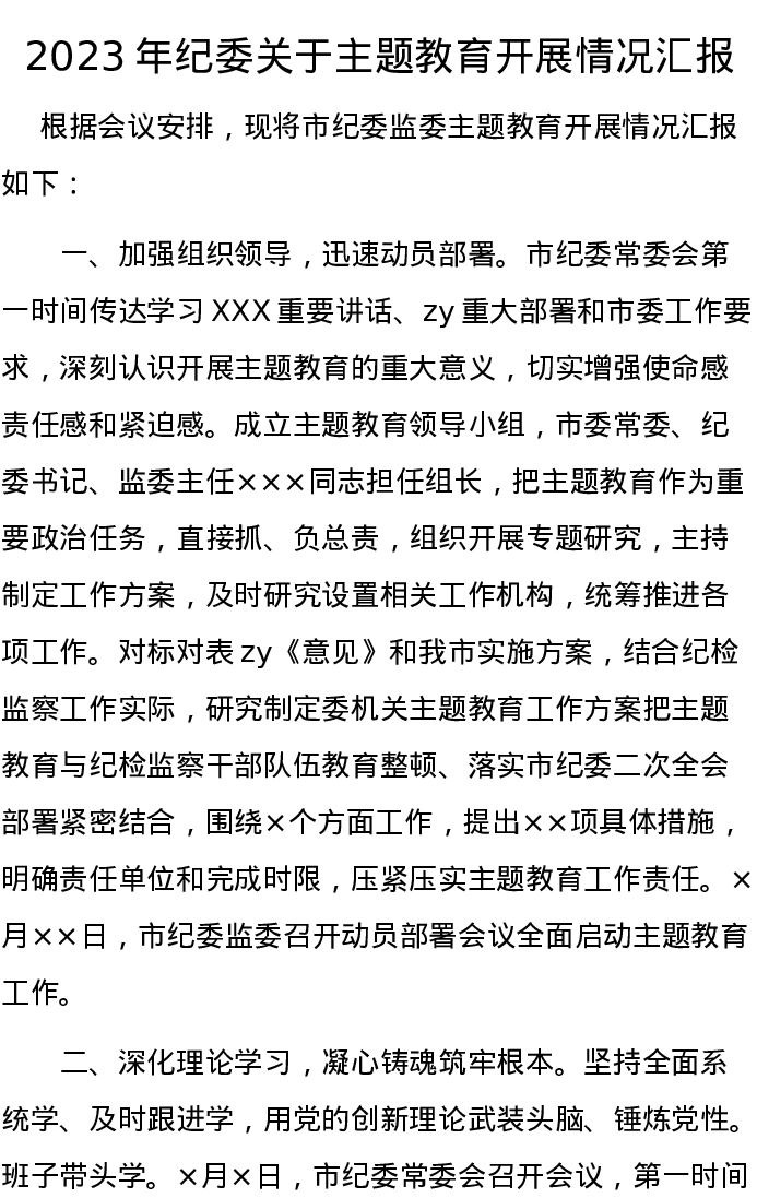 2023年纪委关于主题教育开展情况汇报(特色社会主义思想)