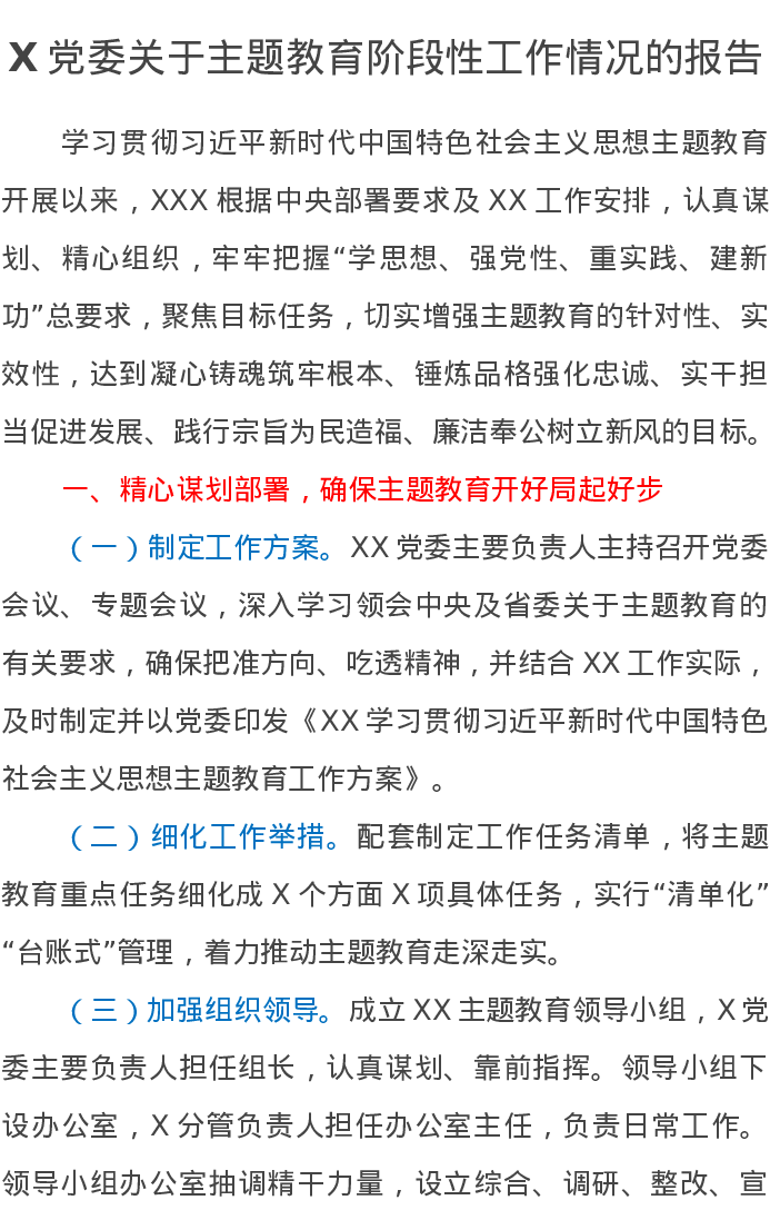 X党委关于主题教育阶段性工作情况的报告(特色社会主义思想)