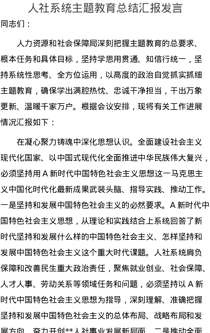 人社系统主题教育总结汇报发言(特色社会主义思想)
