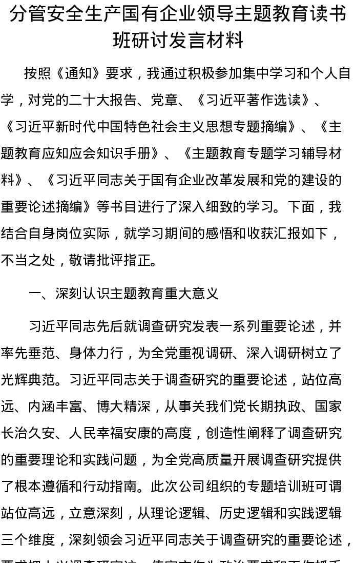 分管安全生产国有企业领导主题教育读书班研讨发言材料(特色社会主义思想)