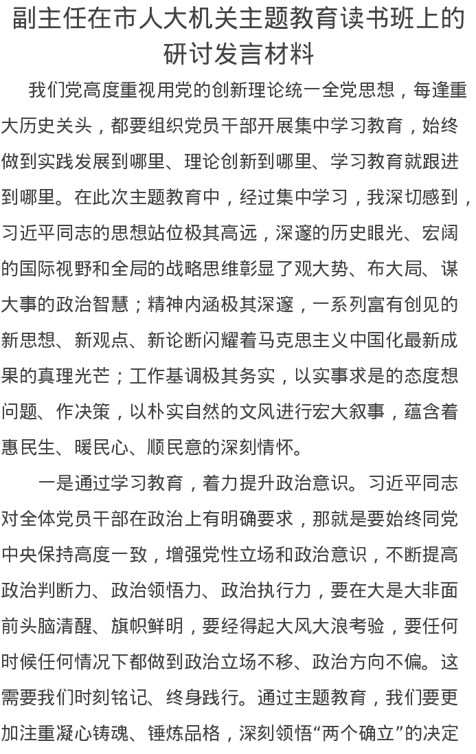 副主任在市人大机关主题教育读书班上的研讨发言材料(特色社会主义思想)