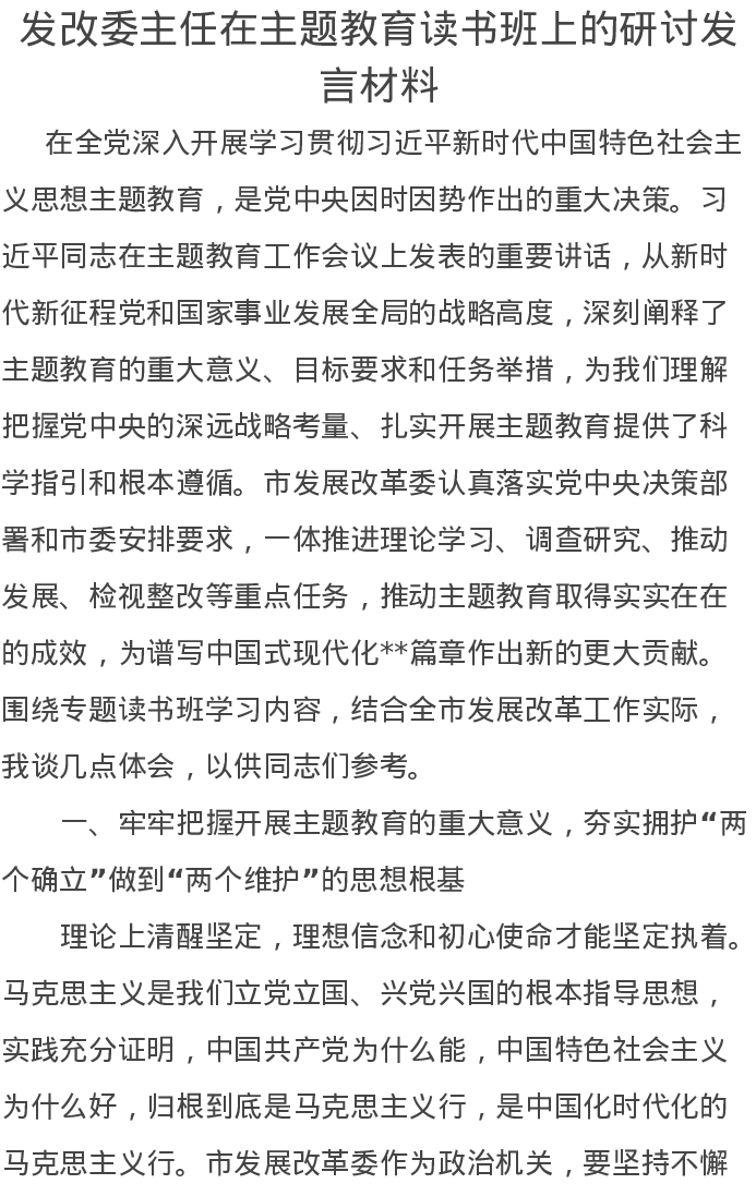 发改委主任在主题教育读书班上的研讨发言材料(特色社会主义思想)