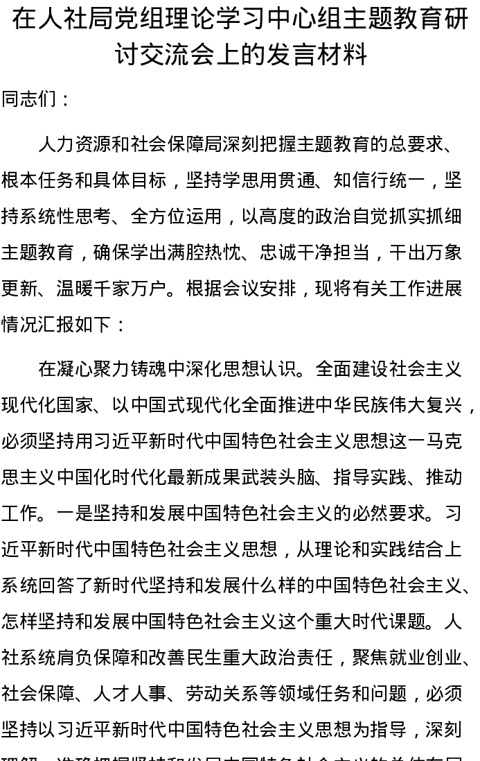 在人社局党组理论学习中心组主题教育研讨交流会上的发言材料(特色社会主义思想)