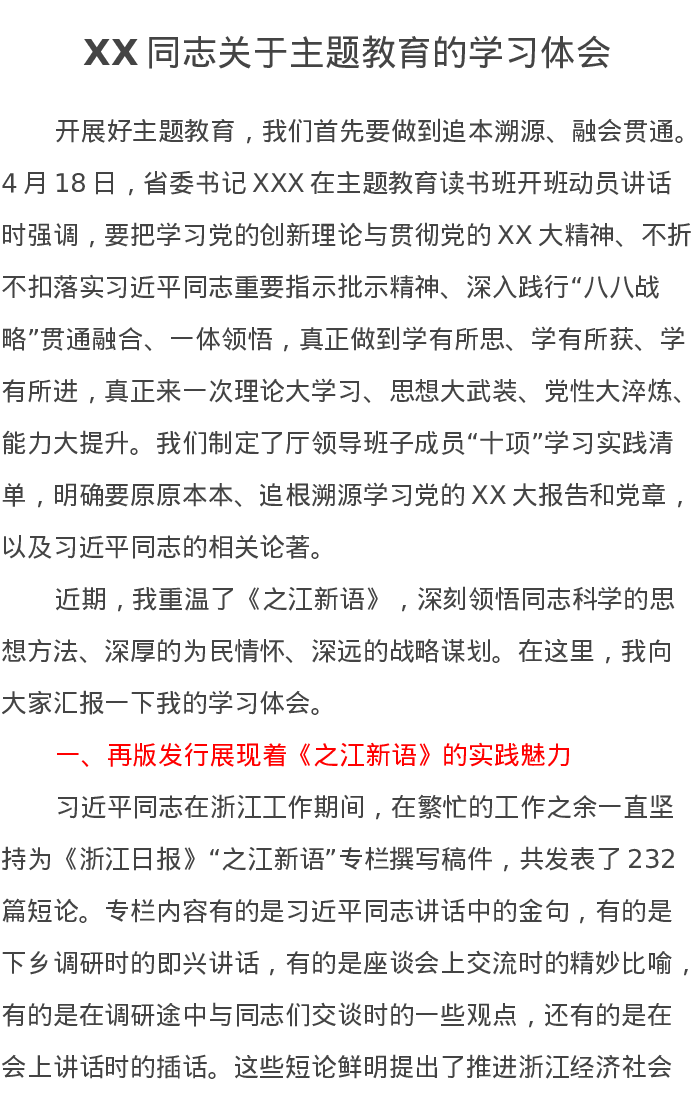 XX同志关于主题教育的学习体会(特色社会主义思想)