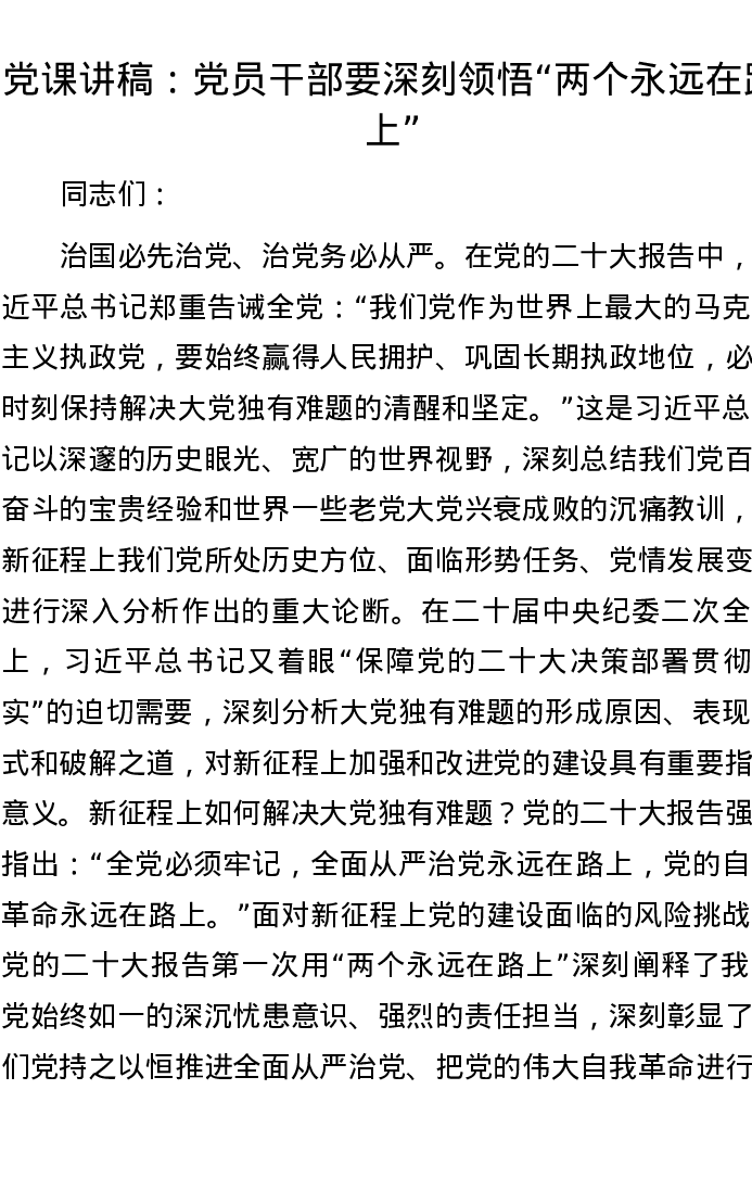 党课讲稿:党员干部要深刻领悟“两个永远在路上”