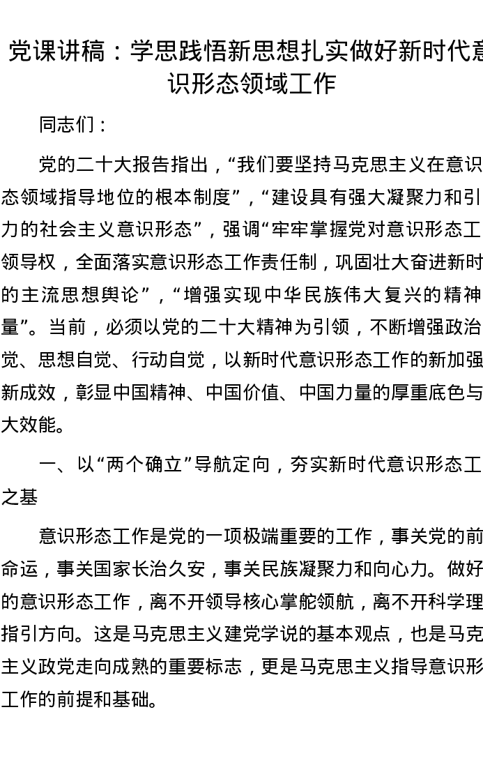 党课讲稿:学思践悟新思想 扎实做好新时代意识形态领域工作