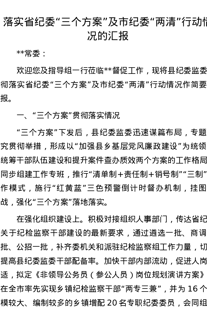落实省纪委“三个方案”及市纪委“两清”行动情况的汇报