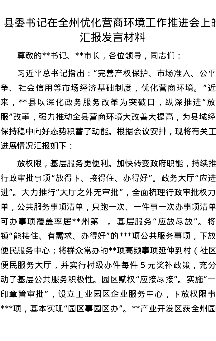 县委书记在全州优化营商环境工作推进会上的汇报发言材料