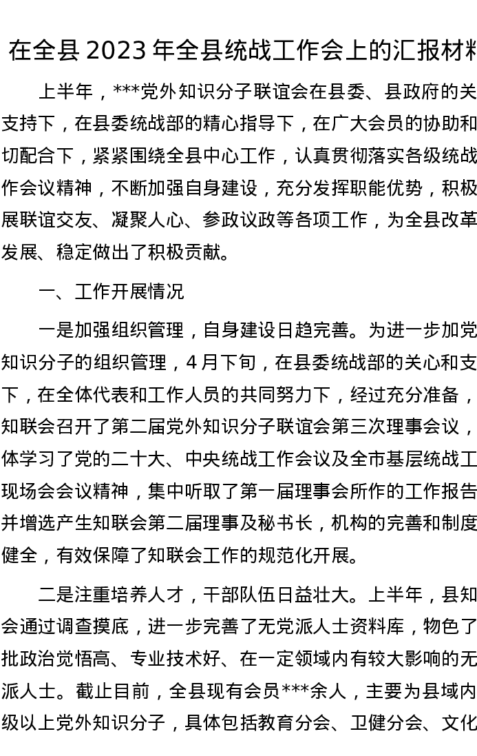 在全县2023年全县统战工作会上的汇报材料