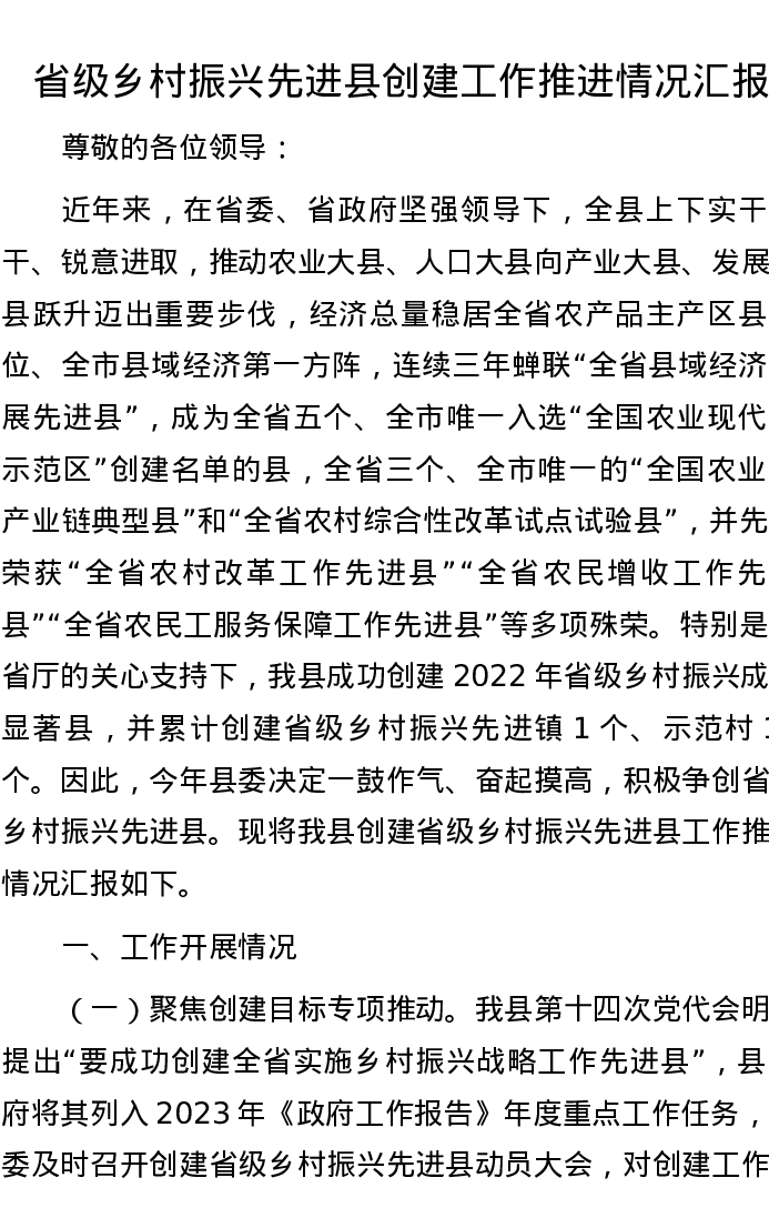 省级乡村振兴先进县创建工作推进情况汇报