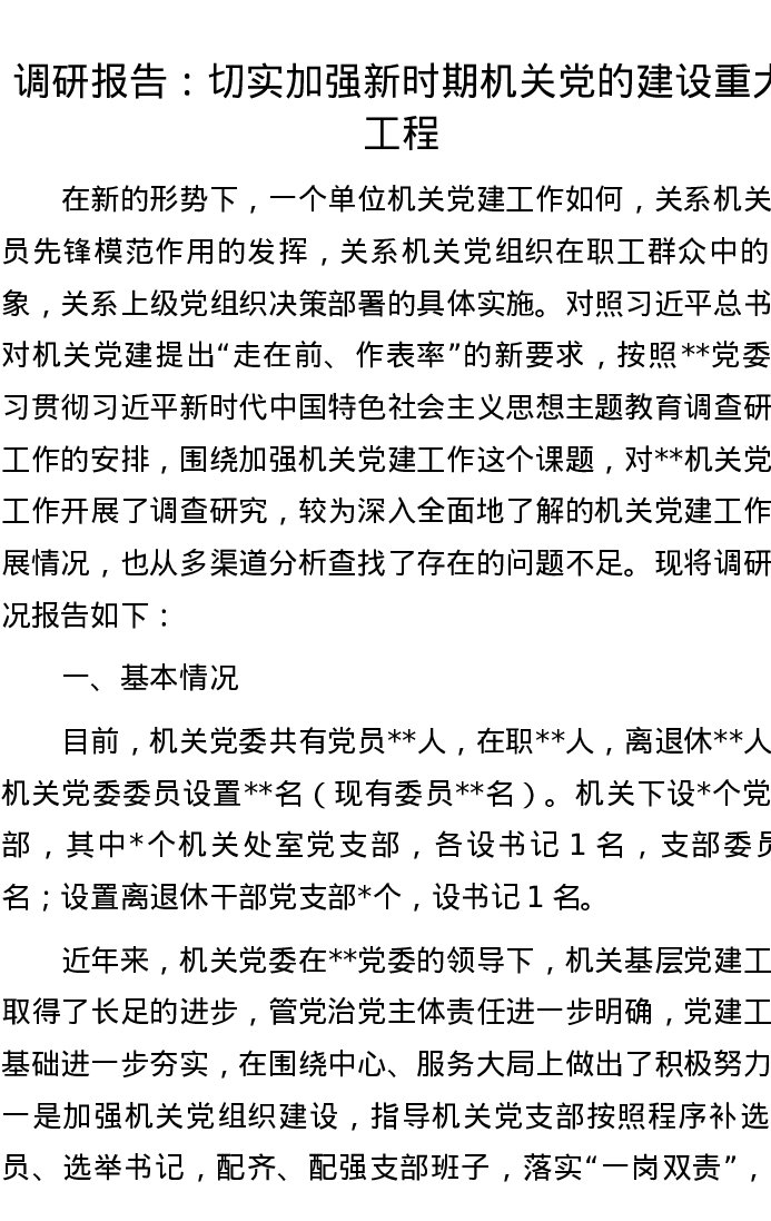 调研报告:切实加强新时期机关党的建设重大工程
