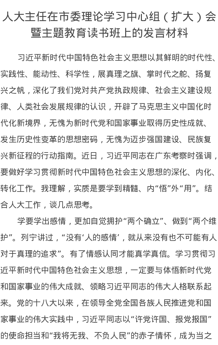 人大主任在市委理论学习中心组(扩大)会暨主题教育读书班上的发言材料(特色社会主义思想)