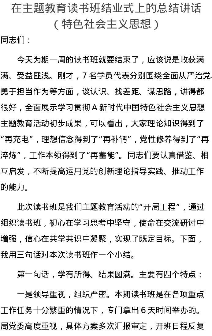 在主题教育读书班结业式上的总结讲话(特色社会主义思想)