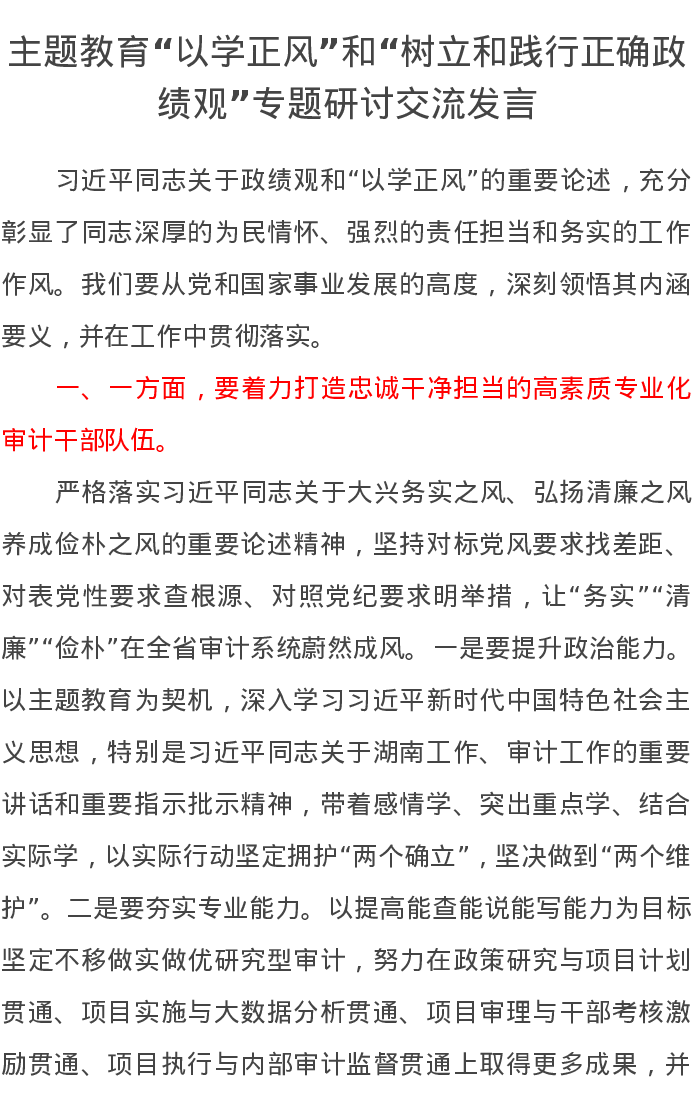 汇编:主题教育“以学正风”和“树立和践行正确政绩观”专题研讨交流发言2篇(特色社会主义思想)