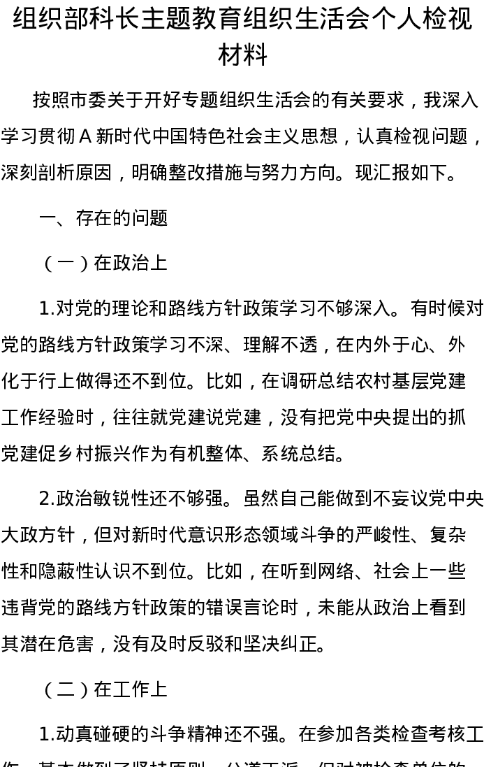 组织部科长主题教育组织生活会个人检视材料(特色社会主义思想)