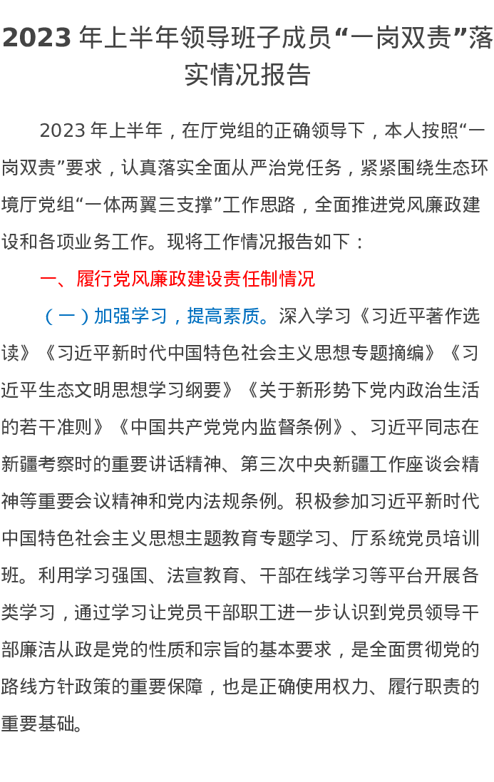 2023年上半年领导班子成员“一岗双责”落实情况报告