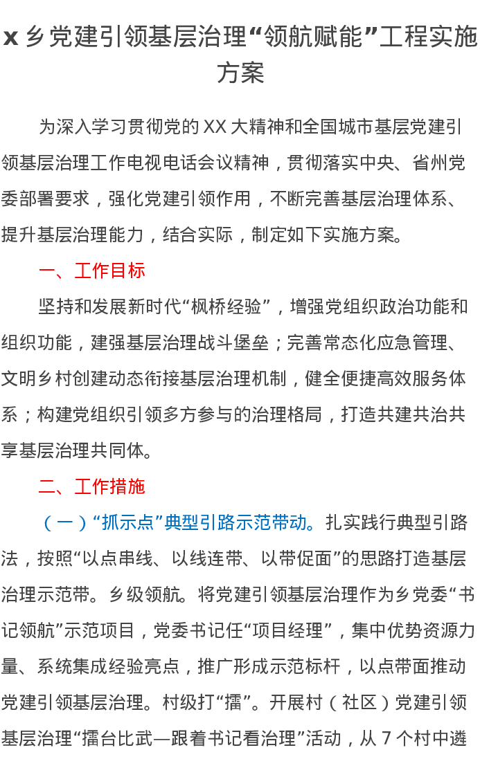 x乡党建引领基层治理“领航赋能”工程实施方案