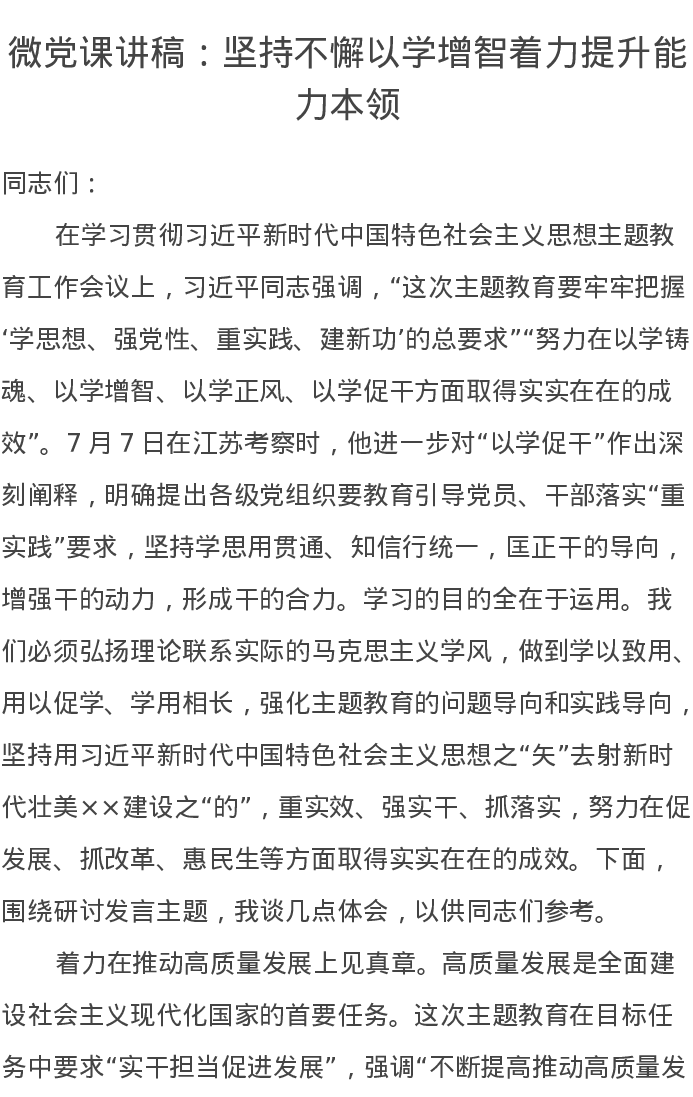 微党课讲稿:坚持不懈以学增智着力提升能力本领