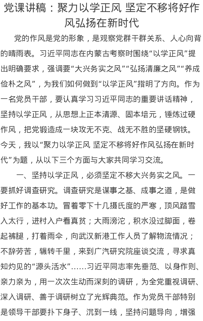 党课讲稿聚力以学正风坚定不移将好作风弘扬在新时代